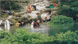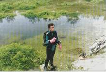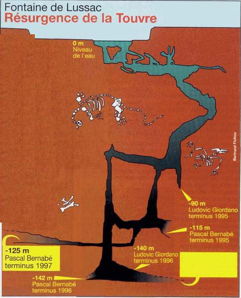 Depuis 1995, une intense activité anime, chaque été, le paisible village de Ruelle-sur-Touvre (Charente). Plus précisément dans le parc qui abrite les célèbres sources de la Touvre, zone hydrokarstique complexe qui donne naissance à trois fontaines. Le Dormant semble rapidement colmaté au fond d'une vaste vasque. Du Bouillant, tout proche, en revanche, jaillit un puissant courant accentué par l'étroitesse de la zone d'entrée. Cette source, explorée dans sa zone profonde à -80 mètres par Ph. Lance, -133 mètres par Cyril et à -148 mètres en 1990 par Olivier Isler, se présente comme un long couloir très pentu terminé par une modeste galerie horizontale. Enfin, à une centaine de mètres à vol d'oiseau, on trouve la fontaine de Lussac, un peu à part, elle-même assez complexe, bien qu'en relation évidente avec le Bouillant. |