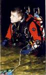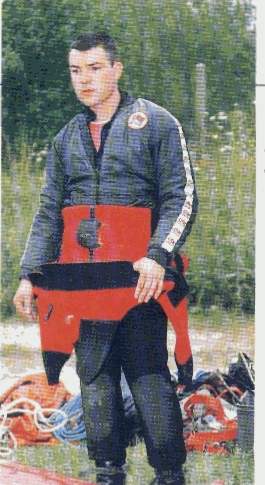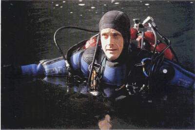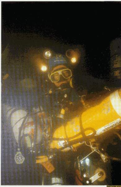| Six bouteilles de 20 litres, une de 3 litres d'argon pour insuffler le vêtement, les Wings, le casque avec 3 lampes et un phare MLS, 3 profondimètres, une montre, un dévidoir garni de de fil d'Ariane, une boussole, un ciseau, un sécateur, un plomb largable, des élas-tiques de chambre à air, deux jeux de tables, une gueuse, des plombs de chevilles, un masque de secours, sans compter les multiples épaisseurs de fourrure polaire, ne rendent pas l'individu très aquatique ! c'est donc un piètre spectacle de mise à l'eau que j'offre aux promeneurs du parc de la Touvre ! Je m'enfonce dans le canyon jusqu'à -12 mètres et dois tirer sur la corde pour franchir le rétrécissement de l'entrée. La visibilité n'est pas très bonne, les fortes pluies ayant probablement remué le tapis d'argile posé sur le fond de la galerie. A -21 mètres, derniers réglages de configuration, mise à zéro du chrono, changement de gaz et c'est parti pour une longue descente entrecoupée de replats. |
