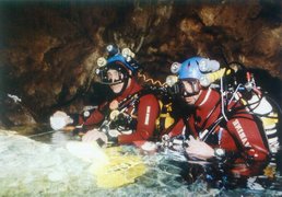 9H45 - Equipés d'un tri bouteille dorsale et d'un mono ventral, nous nous enfonçons dans le siphon. Nous allons de relais en relais. Tout se passe bien: notre entraînement au palmage et à la plongée profonde porte ses fruits. A -68m, le siphon devient boueux ; à - 40 m, échangeons notre dernier relais, et reprenons notre progression, en prenant garde de ne pas soulever trop de boue. Nous parcourons 750 m en 35', et atteignons notre premier palier, -12.