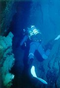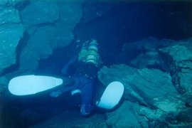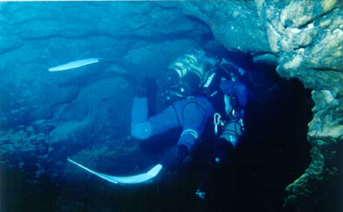 Nous inhalons 15' d'oxygène médical chacun, permettant une meilleure désaturation d'azote Nous faisons quelques photos, et nous nous alimentons de produits très énergétiques sélectionnés et fabriqués par VITAGERMINE SPORT. Deux heures plus tard, nous décidons de la suite des opérations : Didier, le plus en forme , sera l'explorateur du S3. Je l'aide à s'équiper ; il endosse son tri bouteilles et se met à l'eau. J'attache le fil d'ariane et fais quelques photos de ce moment privilégié . Didier part au centre du puits large de 7m de diamètre et se laisse couler. A -11, il cherche un passage entre les gros blocs qui masquent la galerie qui fait suite ; trouvant une issue, il s'y engage et découvre sa galerie. Celle-ci s'en fonce progressivement jusqu'à -24, et remonte à nouveau. Arrivé à la base d'un grand puits, Didier remonte espérant retrouver la galerie sèche. A - 6, il est abusé par une nappe d'eau douce piégée, qui lui donne l'impression de voir la surface de l'eau. Sur le haut du puits, la galerie redescend à nouveau. Didier reprend la progression. A -11, frappé par une migraine soudaine, Didier décide de s'arrêter . I1 coupe son fil d'Ariane , et l'attache au rocher. Distance franchie : 200 m L'orientation générale du siphon est sud-ouest et plus l'on progresse et plus celui- ci devient boueux.
