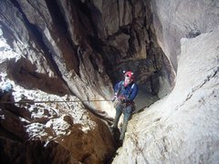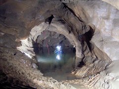 Historique : Cette résurgence majeure du massif du Bugey voit une première série d'explorations à la fin des années 70 par une équipe de plongeurs Suisses. Ces derniers franchissent les trois premiers siphons, réalisent les escalades à la sortie du S3, plongent le S4 (réalisent la jonction entre la sortie du S4 et la galerie supérieure menant au S5) et le S5 (arrêt vers 180m, -32). Le réseau est repris dans les années 90 mais, en 1993, Christian Roy, de retour d'une pointe dans le S5, décède à 150m de l'entrée de ce siphon. Explorations 2006 – 2007 : voilà déjà plusieurs années que le Pertuis me tente. Finalement, au printemps 2006, je reconnais les trois premiers siphons et m'arrête en haut de l'escalade menant au S4. En parallèle, Stéphane Lips et Renaud Locatelli rééquipent l'escalade menant au S5. A l'automne 2006, malgré des conditions de visibilité déplorables, je fais une plongée de reconnaissance dans le S5 afin de vérifier l'état du fil d'Ariane et de prendre contact avec le siphon (bi 10l, 1 relai nitrox 35% de 7l et un relai nitrox 70% de 4l en déco). Lors de cette plongée, j'atteins le terminus de Christian Roy à 250m, -42. La suite est devant moi dans une galerie large (a priori car ce jour là, je n'ai que 1m de visibilité !) mais je sais que si ça continue à plonger il faudra envisager plus de matériel. Le 23/12/2006, aidé de Michel Guis et Jean-Michel Vallon, je dépose 3 bouteilles dans la galerie menant au S5 (2 relais nitrox 35% de 7l et un relai nitrox 80% de 6L pour la déco). Le 7 avril 2007, après 4 mois d'attente liés à des conditions météo défavorables, nous voici réunis pour la pointe. Sont présents Michel Guis, Stéphane Lips (qui en profitera pour plonger le S4), Jérôme Perrin, Vincent Lignier. Jean-Michel Vallon, malade, viendra également nous aider à sortir le matériel. Vers 10H00, nous partons dans le S1. Derrière le S3, nous hissons mes deux bouteilles de 10l dans le P10, puis prenons le chemin du S5 et prenant au passage les relais déposés en décembre. Vers 12H30, je m'engage dans le S5 équipé de 5 bouteilles (mon bi 10l, deux relais de 7l en nitrox 35% pour la progression et un relai de 6L en nitrox 80% pour la déco). La visibilité est correcte et la progression agréable. Je passe le point bas à -32m, remonte et dépose mon premier relai vers 150m. Vers 200m, je dépose le deuxième relai, attache mon fil d'Ariane (cela m'évitera de le faire au terminus à -42 et me permettra de gagner quelques minutes de paliers) et poursuis avec mon bi 10l. La galerie est effectivement large (env 3m de large sur 2m de haut). Elle est rectiligne et descend en pente douce. Je passe le terminus et continue l'exploration : la galerie est toujours rectiligne mais descend toujours. Je reste au plafond et déroule 70m de fil depuis le terminus. Arrivé à -52m (profondeur limite que j'avais fixée), j'attache mon fil et fais demi-tour. La galerie continue toujours avec la même section, mais à cette profondeur les paliers de décompression défilent vite…il faudra revenir avec du trimix. Le retour se passera bien et je commencerai mes paliers à -6m (42 minutes au total dont 8 à 6 mètres). Ayant opté pour une combinaison « humide », je passerai mon temps à palmer pour retarder l'arrivée du froid (eau à 10°C) et apprécierai le sentiment de sécurité apporté par mon nitrox 80% ! Sortie du S5 après 85 min de plongée. Au retour, Vincent et Michel en profite pour prendre de nombreuses photos. Nous ressortons tout le matériel et regagnons l'air libre vers 17H30. La prochaine plongée se fera au trimix (Hélium, oxygène, azote) et nécessitera une logistique bien plus lourde mais permettra de pousser l'exploration plus loin avec des conditions de sécurité optimales.