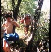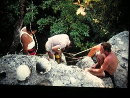 Nous étions en plein travail d'équipement. Le REMEJADOU est un énorme effondrement séculaire. Aujourd'hui, la rivière passe tout au fond et présente deux siphons, un en amont et l'autre en aval. C'est elle qui a rongé la roche et produit cet aven au cours des siècles ! Pour descendre, nous-même et notre matériel, nous avons trouvé un endroit, bien dégagé, aux bords du précipice. Depuis une vire en surplomb (une petite plate-forme rocheuse), on plantait nos « spits » d'ancrages pour nos échelles et nos cordes. On se servait, aussi, des arbres environnant pour assurer nos équipements ! Pas facile de descendre 32 mètres plus bas. Mais on en avait vu d'autres ! Ici nous étions bien, sous un beau soleil et dans ce magnifique bois. Une journée de préparation, pour envoyer nos échelles et nos cordes au fond de cet aven. On faisait la descente sur descendeur, un appareil très simple, mais efficace, pour se laisser glisser le long d'une corde. On se sent comme une araignée sur son fil ! Je me retrouvais près de cette rivière, avec Pépé et Daniel. Tout là-haut, Bob, Marcel, Guy, Henri B. et Henri P., nous envoyaient les sacs de matériel, les équipements de plongées, le dérouleur et toute la signalisation. Tous cela avec nos cordes spéléologiques. En bas, on réceptionnait tout notre matériel et les cordes remontaient pour un nouvel arrivage. Pas mal tout cela, mais, c'est vrai, qu'il fallait bien une journée de préparation ! Le matériel était à poste, ils ne nous restait plus qu'à remonter. Autant la descente était agréable et spectaculaire, autant la remontée était très dure. J'avais fait quelques remontés aux « jumars ». Dans ce cas, nous avons une pédale, fixée par une longe sur notre baudrier. L'autre est fixée au niveau de notre poitrine, sur le baudrier, bien sûr. Ce sont des systèmes autobloquants, qui permettent de remonter sur une corde, mais qui ne peuvent jamais redescendre avec leurs systèmes antichute ! Personnellement, j'ai fais des remontées de 30 à 40 mètres avec ce dispositif. Quand vous arrivez en haut, vous tirez une langue comme un chien qui n'a pas bu depuis trois jours ! On est complètement cassé ! Là, c'était une remontée à l'échelle et c'est aussi crevant ! Tout était prêt, le matériel près de cette rivière, nous ferons nos plongées le lendemain. Cette nuit là, Henri P. et moi dormons aux alentours, sur nos matelas pneumatiques et dans nos duvets. Bien que les risques de se faire voler du matériel, 32 mètres plus bas, ne soit pas élevé, il fallait que l'on s'assure que personne ne viendrait saboter l'installation de nos échelles et de nos cordes. Sinon, c'aurait été le casse-gueule inévitable, avec tout ce que cela comporte de drames. Déjà que cela n'était pas facile comme ça ! Les copines et les copains étaient partis en nous laissant à manger et à boire ! Si un orage avait éclaté, on n'avait plus qu'à courir retrouver l'estafette garée à plusieurs centaines de mètres pour se mettre à l'abri. On s'est endormi à 10 ou 20 mètres de nos équipements. Dans ces cas, on ne dort que d'un seul œil, attentif à tous les bruits de la nuit, en plein air, sous les arbres !! Au petit matin, les copines nous amenaient un petit déjeuner et à l'aide d'un réchaud « camping gaz », elles nous ont préparé un bon café et des biscottes beurrés ! Encore, merci les filles !!! Henri et moi, on se réveillait dans une ambiance super sympa ! Tout le monde a déjeuné avec nous ! Bon, ce n'était pas le tout ! Contrôle des équipements installés la veille. Henri et moi n'avons pas eu de problème au cours de cette nuit, on n'avait rien remarqué, ou entendu de spécial. Malgré tout, il valait mieux vérifier pour commencer notre expédition ! Et puis, c'était le départ pour rejoindre notre matériel au fond de l'aven, sur nos descendeurs. Les scaphandres gonflés au maxi et tout nos équipements, dérouleur, signalisation. Tout cela installé et nous nous sommes équipés de nos tenues de plongées. J'étais plongeur de sécurité pour Pépé et Marcel qui partaient explorer le siphon amont. 130 mètres d'une progression difficile et ils sont revenus. Les derniers arbres donnent directement sur l'à pic et si l'on ne connaît pas l'endroit, cette verticale étant masquée par la végétation, on peut faire une chute mortelle. A gauche, le dessin d'une de nos échelles et la petite vire d'où l'on pouvait ancrer nos équipements et les arbres alentours qui nous servaient aussi pour faire de bons points solides de sécurité. Les commentaires que j'avais écrit sont bien lisibles aussi ! Pépé et Marcel étaient revenus. Je restais en sécurité, tandis que Bob et Daniel partaient tenter leur chance. Ils n'ont guère pu aller plus loin. Le siphon était déjà poudré par le passage de Pépé de Marcel. Mais rien ne laissait l'espoir de trouver une continuation dans cette partie amont du siphon de cette rivière. On était déçu, rien à faire, pas de réseaux supérieurs ou de possibilités de déboucher. On se concertait : « Bon, je crois que du coté amont il n'y a plus grand-chose à espérer ! disait Marcel Faut aller voir en aval ! Disait Pépé Ce n'est pas trop tard pour aujourd'hui, on peut tenter quelque chose ! » Nous devions nous réorganiser, toute cette expédition était difficile. Tout là-haut, restaient nos copines et quelques copains qui attendaient les résultats. Ici, vers cette rivière, nous étions encore quatre à ne pas avoir plongé, Guy, Henri P., Henri B. et moi. « Qui veut tenter le siphon aval ? demandait Marcel Mon scaphandre est intact Marcel, je peux partir ! Ok Denis ! Moi aussi, ajoutait Henri P. Ca marche les gars, je vous assure ! dit Henri B. Bon, vous êtes tous parés ? Pas de problème pour moi ! Pareil, je peux partir avec Denis ! Je me mets en assurance ! confirmait Henri B. Avec Marcel on reste au dérouleur ! dit Pépé On attend vos signaux