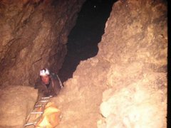 Nous sommes partis dans ces galeries en direction du lac qu'ils nous avaient signalé. Après le franchissement de l'étroiture, on avait des échelles à descendre. Là, on arrivait dans une salle grandiose ! Elle avait des dimensions impressionnantes. Presque comme un terrain de football et plusieurs dizaines de mètres de haut ! Mais il fallait que l'on continue dans toutes ces galeries déjà répertoriées par les spéléologues, pour faire l'approche de ce lac.