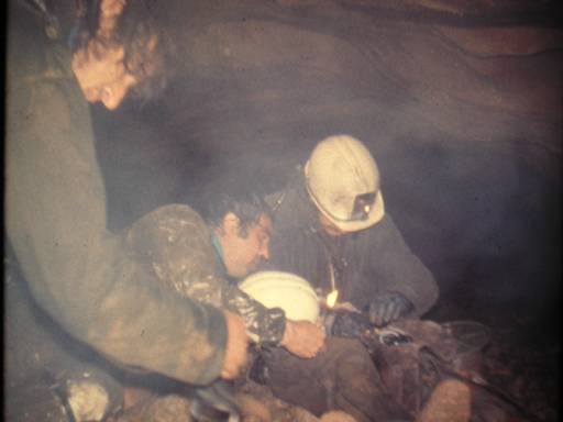 Ce site est près du peyrol de Beaulieu, proche d'une voie ferrée, plus haut, près d'une falaise. Les Ardéchois, connaissants les résultats, nos échecs, dans le peyrol de Beaulieu, on fait des recherches aux alentours et repéré un trou souffleur. Nous suivions leurs travaux de très près, en relation avec eux, depuis Lyon ou lorsque nous étions en Ardèche. Pensant qu'il y avait peut-être un lien entre ce trou et le peyrol de Beaulieu, patiemment, à l'aide de petites charges de dynamites, ils ont foré un passage dans la roche. Des jours de travail pour réaliser un passage au pied de cette falaise. Au final, ce conduit, un trou d'homme comme on dit, était creusé sur presque 10 mètres de profondeur et descendait presque à la verticale, pour aboutir dans une vaste salle. Les spéléologues avaient déjà exploré cette nouvelle grotte, topographié et regardé toute les possibilités de continuation. Ils nous ont fait part de la présence d'un lac souterrain.