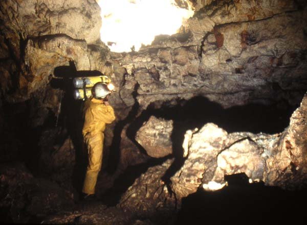 Péniblement, nous sommes arrivés à bout de cette pente très rude et, assis, sur les roches alentours, nous avons regardé autour de nous. En bas, ce n'était pas la joie, on ne distinguait pratiquement plus nos équipements de plongée, tellement l'avalanche de pierre recouvrait nos scaphandres et le reste de notre matériel. Puis nous avons regardé la galerie qui se présentait là, devant nous. Je pense pouvoir dire que personne n'était jamais venu ici avant nous. Nous étions les premiers hommes à pénétrer en ces lieux. J'en suis sûr :