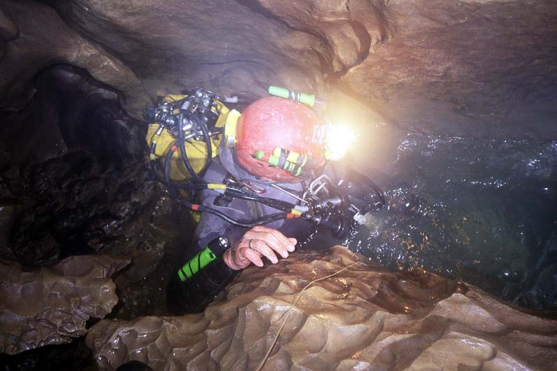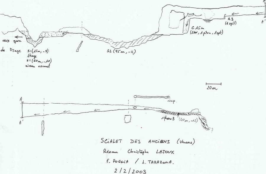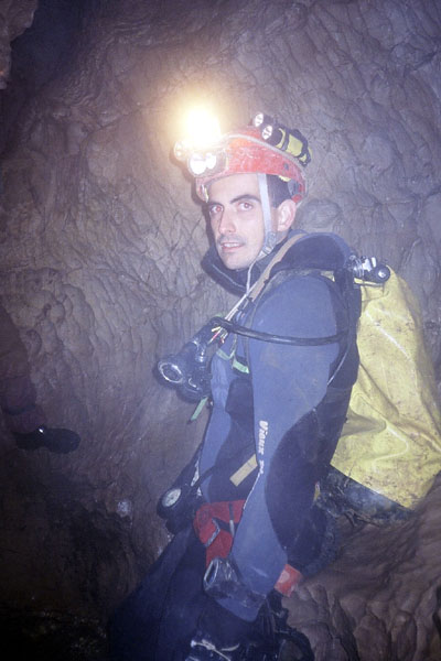 Cette plongée se déroule dans la rivière où arrive le scialet des anciens (à la base des puits, le S1 est à 30 m en amont dans la rivière). Il y a quelques mois, Fredo avait franchi S1 et S2 puis s'était arrêté sur une cascade de 15m à remonter en artif.