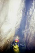 Une fois prêt, nous nous laissons descendre sur 3m le long d'une corde pour rejoindre la vasque. Celle ci nous paraissant tapissée de boue, nous mettons palmes et masque en essayant de ne pas trop remuer.