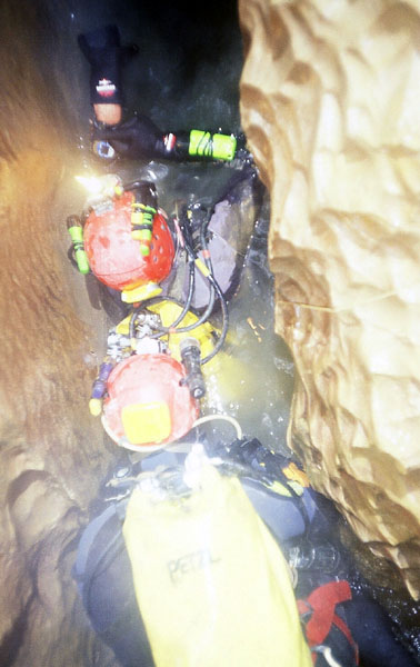 Premier départ : juste après avoir mis le masque dans l'eau, nous comprenons que le siphon n'est en fait qu'une voute de 2m de long. Par contre, il nous faudra décapeler notre bi 3L pour passer le point bas qui est assez étroit.