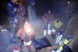 Derrière, nous retrouvons nos amis abrités sous un confortable point chaud. Très rapidement, ils prendront en charge la remontée du matériel et tout le monde sera sorti du trou le dimanche matin à 8h30 après 16h00 passées sous terre et déjà l'envie de plonger le siphon que nous venons de découvrir.