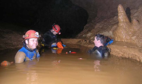 DATE: 1-5-2005 Au cours de notre dernier voyage ici, le 09-08-04 (bulletin 153 du CDG), le plongeur A. Judd a passé le siphon 5 (aval) et a progressé en aval sur approximativement 30 mètres jusqu'à un siphon 6 non exploré. Il a également signalé une possibilité d'escalade sur des blocs vers la gauche avant le siphon. Nous sommes revenus avec l'intention de continuer l'exploration. Nous avons rencontré le plongeur français Frank Vasseur le matin et il nous a donné un bon coup de main ce jour là, ainsi que tout au long de notre exploration. Encore une fois une grande quantité de matériel de plongée et de matériel de désobstruction fut descendue dans la salle principale et rapidement AJ et JB ont pu se lancer dans l'inspection du siphon aval et commencer la désobstruction. Environ 30 minutes plus tard AJ est revenu annoncer que l'étroiture était ouverte et pouvait être franchie. N'en croyant pas un mot MBT s'est immergé avec une bouteille et a directement traversé Seoubio 2 stupéfait. Après que tous les plongeurs aient encore un peu élargi. MBT est revenu chercher FV et pour se diriger en aval vers le siphon 2 afin de réaliser des photos du gisement d'os. Tous les plongeurs, très excités, ont ensuite regagné la surface, ainsi que quelques bouteilles vides. DATE: 2-5-2005 L'objectif était que tous les plongeurs aillent au terminus connu de la cavité et pour JB de plonger le siphon 6 vu par AJ le 09-08-04. Tous les plongeurs ont traversé le siphon 1 avec un équipement minimal et le reste du matériel a été acheminé dans des sacs pour faciliter le franchissement de l'étroiture. MBT et JB sont partis vers le terminus, suivis d'AJ et de LJT un peu plus tard. À l'arrivée au siphon 5 il est apparu que le siphon se passait par une voûte mouillante. Les deux plongeurs ont traversé le S5. C'est là que le doute s'installa ! Les deux plongeurs s'attendaient à voir un siphon au bout de 30m mais après 60m environ dans le grand passage les deux plongeurs n'avaient pas vu de siphon, mais escaladé une petite pente boueuse sur la gauche menant à un grand passage se poursuivant ! JB ,dans le doute, quitta MBT et abandonna ses bouteilles. Environ 250 mètres plus loin, MBT fut convaincu qu'il était dans une galerie vierge. Le plongeur s'était arrêté sur un autre siphon et avait rejoint JB, lequel avait été rejoint entre temps par AJ et LJT. Dès le retour de MBT, AJ essaya d'expliquer à JB comment il avait confondu une laisse d'eau avec un siphon et raté un passage de 6 mètres de large sur 10 mètres de hauteur sur sa gauche ! Tous les plongeurs posèrent alors leur matériel et transportèrent l'équipement de JB à nouveau vers la vasque où MBT s'était arrêté. Tandis que JB se préparait à plonger le nouveau siphon 6, AJ suggéra de vérifier que ce siphon était bien un siphon! LJT nagea rapidement au-dessus du lac, tourna à droite, passa par une ouverture large mais basse (1metre) et poursuivi l'exploration du grand passage. À ce moment là JB était sans bouteille et suivait LJT à travers le lac, puis au-dessus dans une grande fracture. Les plongeurs passèrent devant une belle galerie aval sur la gauche et finalement atteignirent le vrai siphon 6 après encore 200 mètres. Le matériel de JB fut récupéré et amené au siphon. JB plongea le siphon 6 sur 55 mètres à -6 mètres rejoignant la surface dans une petite cloche avec deux petits conduits se poursuivant. Le plongeur supposa que la suite était sous l'eau se réimmergea durant 15 mètres dans un large conduit noyé pour aboutir dans une autre petite cloche prolongée par d'étroits conduits. Le plongeur fit demi tour à ce moment là. Pendant que JB plongeait et LJT aidait le plongeur, AJ et MBT observaient le déversoir signalé plus tôt sur la gauche. Celui-ci s'est avéré être un large passage fossile avec plusieurs embranchements. Les plongeurs ont localisèrent bientôt un passage au-dessus de quelques concrétions et beaux gours et descendirent à nouveau dans une large fracture parcourue par un écoulement. MBT et AJ le suivirent jusqu'à un lac qui semble également remonter vers un autre ruisseau (probablement le ruisseau provenant du siphon 6). Approximativement 500 mètres de grotte ont été explorés depuis la jonction jusqu'au lac amont. La cavité continue manifestement mais les deux plongeurs ont du revenir pour aider JB à ressortir. Tous les plongeurs sont alors sortis de la grotte laissant la majeure partie de leur équipement dans Seoubio 2 et ressortant avec un minimum de matériel. DATE: 4-5-2005 AJ et LJT se sont reposés aujourd'hui et ont refusé de continuer, c'est donc MBT et JB qui sont retournés jeter un coup d'œil à la nouvelle prolongation. Ils ont topographié les siphons 5 à 6 à partir desquels débutent les parties aval explorées la veille. Pratiquement 1000 mètres de cavité ont été explorés, les plongeurs poussant sur environ 400 mètres au delà du lac amont dans une large fracture, mais c'était plus étroit et plus boueux. Un autre diverticule sur la gauche a été exploré et les plongeurs ont fait demi tour dans une grande galerie fossile pleine de concrétions très boueuses mais splendides. La cavité semble devenir impénétrable et les plongeurs n'ont pas vraiment eu envie de poursuivre en rampant. Sur le trajet retour, les plongeurs ont nettoyé le fil par endroit dans tous les siphons alors que la visibilité se détériorait et plusieurs ancrages avaient lâché. Au retour, les bouteilles vides utilisées au cours des deux dernières plongées ont été ressorties pour être regonflées. DATE: 6-5-2005 L'objectif était de continuer l'exploration et de plonger Seoubio 6. JB et MBT ont démarré l'exploration depuis Seoubio 2 d'abord suivi de LJT et d'AJ. MBT et JB ont continué pour explorer la galerie terminale tandis qu'AJ et LJT sont descendu un puits de 4 mètres a proximité de la crevasse menant au terminus. Malheure