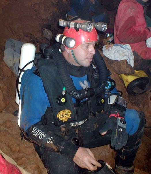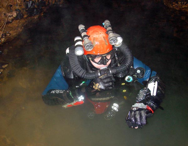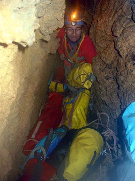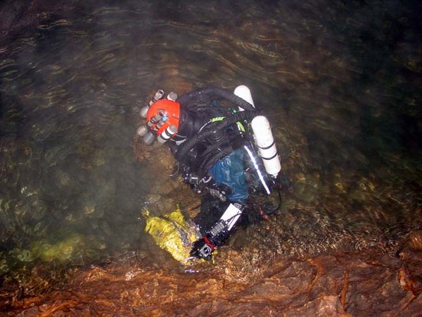 Cette plongée faisait suite à celle, organisée par le SCAL en 1994, qui avait révélé la suite de ce siphon et permis une progression de 285m. Jusqu'à 500m dans une cloche effilée en fracture impénétrable et sans circulation d'eau. A l'époque, avec Michel Enjalbert, nous avions orienté les recherches subaquatiques vers une émersion éventuelle, en vue de retrouver un cours actif. Aussi, avions-nous consciencieusement raclé les plafonds plutôt que le sol du siphon. Avec le temps, l'image des dunes de sable ciselées de ripple-marks, sur le sol de la galerie noyée, incitait à revoir le choses sous un autre angle. Et puis, le potentiel des Monts de Saint-Guilhem, les hiatus sur l'impluvium de la source du Cabrier demeurent considérables. Ca méritait bien de revoir les choses. D'autant plus que l'évolution des techniques et du matériel permet d'aborder ce type de plongée avec plus de sérénité qu'à l'époque. Les vêtements étanches en toile (souples), dotés de purges urinaires (afin de pouvoir rester longtemps immergé et dans la combinaison), les mélanges gazeux (qui atténuent les risques de narcose et diminuent la saturation des tissus) et, luxe suprême, le recycleur (Megalodon version manuelle – Copis) qui diminue la consommation de gaz, minimise la saturation des tissus corporels, rend plus confortable l'immersion (air respiré chaud et humide). Au printemps 2007, quelques contacts préalables avec Jean-Paul confirmaient le soutien du S.C.A.L., qui assurerait l'équipement de la cavité et viendrait en nombre. Avec le renfort de quelques copains et de Jean-Louis, l'inconditionnel de nos aventures cavernicolo-subaquatiques, le projet était remis au goût du jour. La date fut fixée au 26/01/2008. Première difficulté : une barrière à l'entrée du chemin rallongerait la marche d'approche d'un kilomètre. Ce n'est pas rédhibitoire pour une balade dominicale dans le Sergent. Mais pour une sortie plus « lourde », en temps, en matériel et en engagement, autant limiter ce genre de handicap. Jeudi 24, je monte pour un pré-portage des cinq charges les plus lourdes. Ce n'est pas indispensable, mais j'aime ces préliminaires, au moins autant que ces escapades solitaires dans ce somptueux cadre naturel. C'est une de ces journées hivernales à la clarté éblouissante. La couverture émeraude des pinèdes tranche sur l'azur immaculé. Pas d'humidité en altitude, que du bon. La malédiction pluvieuse de cet automne serait-elle conjurée ? La vallée de l'Hérault étincelle d'une couverture de givre en sursis. Le fleuve coule presque clair, la source du Cabrier débite fort, mais cristallin. Bonne surprise, la barrière qui bloque la piste n'est pas fermée, il devient possible de se garer au départ de la combe du Sergent. Le propriétaire du terrain situé à cet endroit, rencontré à la descente, précise que la barrière fut placée par la municipalité pour limiter l'accès, mais pas l'interdire. Nous avons sa bénédiction pour nous garer sur place samedi. Samedi matin, tout baigne, des copains lozériens seront même de la partie. Raymond, à l'enthousiasme et la jovialité communicative, a rameuté large, jusqu'aux piémonts septentrionaux des Grands Causses. Entre désistements de dernière minute et ralliements divers, nous serons assez nombreux pour tout descendre et tout remonter dans la foulée. On se retrouve, on tape un peu la causette. Je retrouve avec plaisir des compères d'escapades caverneuses d'il y a une bonne quinzaine d'années. Jean-Paul et Pierrot, les spécialistes des Monts de Saint-Guilhem, des topos et des désobstructions, Laurent, redescendu de son exil temporaire au pays du Calvados, Samuel, au sourire permanent, Raymond, dynamique et volontaire comme un jeune loup. Les cévenols sont là aussi : Jean-Louis et son appétence karstique inégalée, Patrick et son fiston Samy, novices mais déjà forts de plusieurs portages dans le Gard. J'apprécie aussi de retrouver Jeannot, Fabrice et Alexandre, les lozériens, avec qui plusieurs projets sont actuellement « sur le grill ». Je découvre de nouvelles têtes, la nouvelle garde du SCAL : Thierry, avec qui j'ai échangé par mail, son collègue Jean-Jacques et Sarah, l'unique élément féminin de la troupe. Puis petit à petit, par groupe ou en solo, chacun attaque la montée. La « cheminée », cette nouvelle entrée ouverte après forces escalades et désobstructions en 1993 et 1994 par le S.C.A.L., consiste en une cinquantaine de mètres de puits étroits, progressivement évasés dans la partie inférieure. Etroitesse que j'avais sous-estimée, pensant qu'on pourrait descendre les kits à la corde, depuis l'entrée. Visiblement, l'itinéraire n'est pas une « classique ». Des spits sont rouillés au point de ne plus autoriser le vissage correct des amarrages. Jean-Paul doit d'ailleurs spiter à nouveau un puits. Une fois en bas, la descente des sacs s'avère fastidieuse. Il aurait certainement été préférable de les descendre « à cul » et nous perdons un temps précieux. Finalement, au prix de descentes « musclées », les copains acheminent toutes les charges au bas de la verticale. Les puits sont terminés, on rejoint la « galerie supérieure », au niveau de la salle du sable, 200m avant le « grand lac nord ». Il faudra encore chercher un tantinet pour retrouver les passages conduisant à la vasque tant convoitée. Ce « Grand lac nord » déverse le cours souterrain du Cabrier dans la « grande diaclase ». Elle constitue aussi le premier d'une série de regards sur ce qui est un siphon, franchi via la vasque la plus en amont (4m ; -1) en 1949 par Alex Bournier (SCAL). Nous optons pour une mise à l'eau dans les derniers plans d'eaux, afin de raccourcir au maximum la longueur du siphon, pour ceux qui le franchiront en apnée. Une salle déclive, ponctuée de redans déclives servira de vestiaire. Je monte et assemble les bouteilles de sécurité (une de 9 li