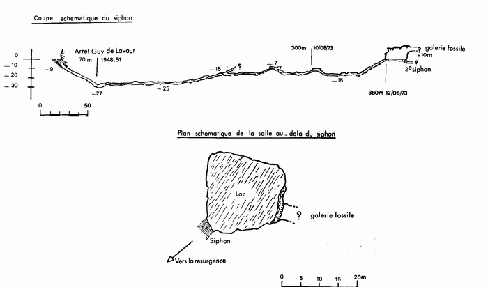 En 1972, deux membres du Groupe Spéléologique de Corrèze plongent à Saint-Georges jusqu'au terminus de Lavaur : petite salle à 70 mètres de la surface ; ils constatent que la profondeur en ce point n'est que de 27 mètres et non - 43. Cette différence de cote importante peut s'expliquer par l'imprécision des instruments de plongée en 1948. Quoi qu'il en soit, cette reconnaissance relançait l'intérêt d'une exploration plus poussée du siphon de la Fontaine et nous décidions d'y effectuer une plongée en août 1973.