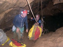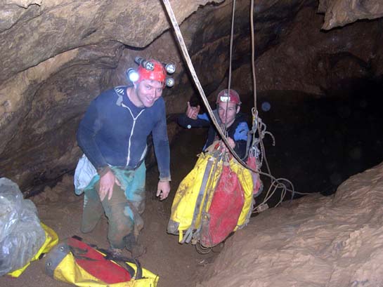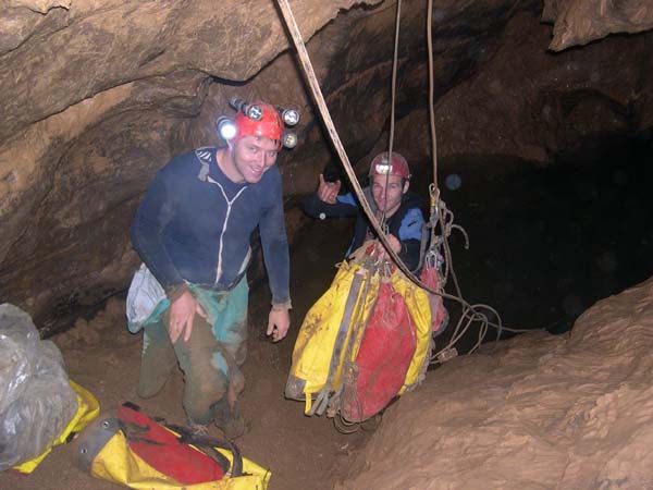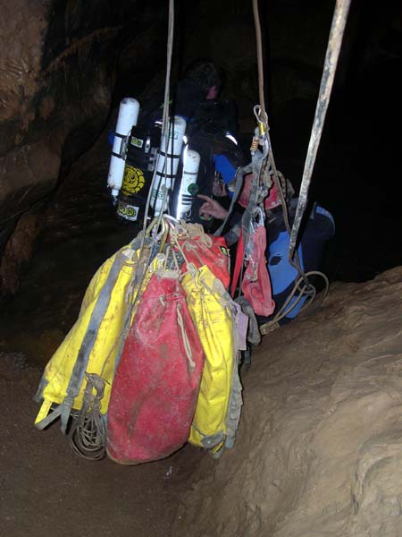 Leçon du jour : mieux vaut plonger avec un niveau d'eau plus haut qui permette de passer du S.1 au S.2 sans trop faire d'acrobaties, comme l'atteste la topographie de Jean-Charles Chouquet, levée en 1988. Pas si simple, car à Trabuc les montées sont très rapides et la vidange lente. En principe la nappe atteint son point bas fin juin jusque vers fin août et s'il n'y a pas d'orages, jusqu'en septembre. Mais cette année, pas de pluies d'équinoxe et le niveau demeure bas. Une crue passe cependant (nos traces de cet été étaient effacées depuis le bas du puits, l'eau est montée jusque-là entre août et décembre) mais il faut attendre la fin de l'automne pour que le niveau se stabilise environ 3m au-dessus de celui de l'été dernier. Petit descriptif du portage : descente par la partie aménagée, puis passage dans la salle de la méduse et descente sur un chaos. Là, un puits permet de faire passer le matos sans forcer (à la corde), pendant qu'on progresse à vide par une succession de passages bas sous des concrétions, jusqu'à la base du puits. Le recycleur monté, il ne manque plus qu'à connecter la tête. Les 4 bouteilles de sécurité étaient prêtes, et déposées de l'autre côté du lac.