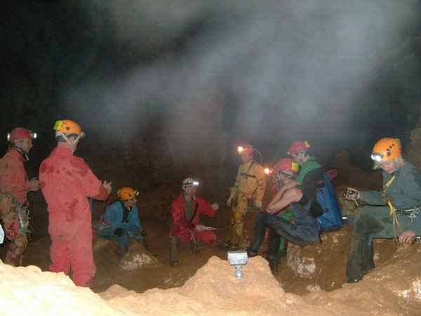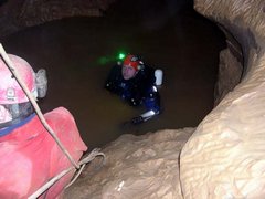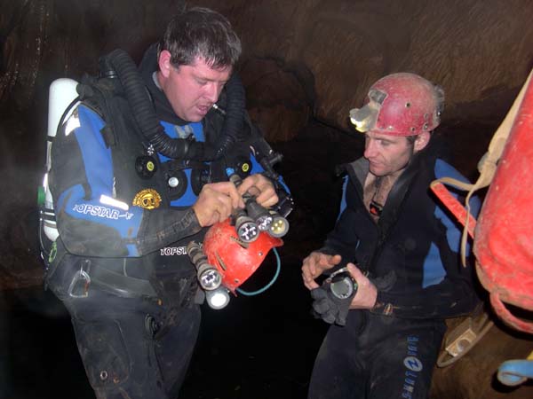 Il y a belle lurette que ce siphon « historique », car plongé par Lucienne Golenvaux dès 1965, était « dans les cartons ». Non pas pour marcher sur les palmes de Lucienne, ce qui, de la part d'un « french lover » aurait été fort inconvenant, mais parcequ'il s'agit du siphon le plus en amont de la cavité. Situé à -100 et environ 500m de l'entrée, ce siphon fut prolongé par la S.C.S.P. (Alès-30) entre 1982 et 1986 (Christian Bagarre, Philippe Nouza, Gil Veyssière) sur 170m (-51). Puis jusqu'à 400m (-30 après un point haut à 21) par Jean-Charles Chouquet en 1988 (topographie), et enfin en 1993 par Marc Douchet qui stoppe dans une galerie étroite et argileuse à la cote 530m. Notre objectif consiste à lever la topographie au-delà du terminus de J.C. Chouquet ainsi qu'à revoir le conduit, des fois qu'une "suite" existe. Nous voilà donc partis le 12 août 2007, pour une ambitieuse aventure. La période, estivale et les congrès associés, n'a pas été pour faciliter la constitution de l'équipe. A l'heure du rendez-vous, les effectifs sont maigres. C'était sans compter avec l'ami Jean-Louis qui motiva moultes équipes en vacances dans le secteur, et finalement, chaque kit trouve épaules à son pied. Avec presque deux heures de retard sur le planning (mais que va donner ma « moyenne » !) nous nous engageons sous terre, entre deux visites guidées. Au terme de la partie aménagée : ressaut équipé en cordes et échelle rigide fixe, petite séance de génuflexion pour découvrir la salle de la méduse et descente sur un chaos. Il suffit de suivre les câbles et les tuyaux raccordés aux pompes destinées à remonter de l'eau jusqu'aux lacs de la partie ouverte au tourisme. C'est d'ailleurs l'eau du siphon Golenvaux qui entretient ainsi, quelques 60m plus haut, les gours contemplés par les néophytes. Là, un puits permet de faire passer le matos sans forcer (à la corde), pendant qu'on progresse à vide par une succession de passages bas sous des concrétions, jusqu'à la base dudit puits. Problème, les amarrages sont en piteux états. Nous bataillons encore une bonne heure pour équiper au moins pire la verticale, en bidouillant entre des plaquettes vissées sur quelques filets et des amarrages naturels sur bouts de sangles glanés çà et là. Ensuite, un lac permanent (on se mouille jusqu'à la ceinture) précède 50m de galerie descendante et légèrement gazée, jusqu'au siphon 28 (dans la nomenclature de la cavité), qui précède de peu le siphon Golenvaux. Le niveau est très bas, mais pas assez pour engloutir les difficultés (escalades, méandre, lac ressaut). En effet, nous comptions sur la vidange de ce premier siphon (d'une vingtaine de mètres) par pompage, pour faciliter et ouvrir à toute l'équipe l'ultime partie du portage, jusqu'au siphon Golenvaux. Là, il est encore plein : je devrais donc haler seul tout le bazar jusqu'au siphon Golenvaux. Deux aller-retour dans le siphon (le S.28). Grimpette un peu raide pour sortir de l'eau avec quelque 80 kg de menue ferraille et de gaz comprimé. Le raidillon suivi d'une méandre moins large me contraint à abandonner une des trois bouteilles. Passage tout en diplomatie en ondulant, autant que faire se peut, de l'excroissance dorsale, puis descente jusqu'au lac. Merci Archimède. Soufflant, suant, je rechausse gaillardement les palmes et repars illico dans l'onde, quêtant avidement l'amorce du puits du siphon Golenvaux. Manque de chance, avec ce niveau bas j'ai perdu un peu le fil (de la description) et le tuyau qui me sert de guide émerge radicalement. Pas de doute, nous n'y sommes toujours pas et il faut consentir une nouvelle escalade, plus ardue que celle pour sortir du premier siphon. J'abandonne les deux bouteilles de sécurité (marre de tout trimbaler pour aller de mauvaise surprise en mauvaise surprise) et rejoins la vasque du siphon Golenvaux. Ca y est, on touche au but ! Enfin, les choses « sérieuses » vont pouvoir commencer. L'eau est limpide. Le faisceau du phare se perd dans les tons azurés, la vasque se fait aguichante, mais . Si le premier siphon était « trop » plein aujourd'hui, le second ne l'est pas assez. Les pompages dans la vasque ont rabattu le niveau de presque deux mètres. Un redan vertical s'interpose. S'il serait possible de rejoindre l'eau en sautant, je n'imagine pas le trajet inverse, à varapper ainsi harnaché. Un coup dans l'eau. Retour dépité avec, la main sur le tas de matériel, promesse de revenir avec les frimas. Unique et maigre consolation : je décroche le record de la plongée la plus courte et la moins profonde en recycleur et avec autant de matériel