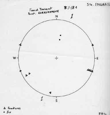 - Stéréogramme 1 avec pôles des couches et fractures (diaclases et paraclases) Ouvertes ou fermées (calcites).