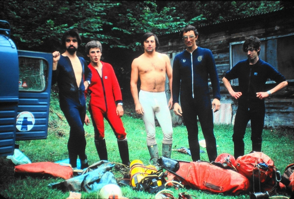 - Le 14/08/82 : Jean-Daniel Larribau et Philippe Tresse (USPA) plongent l’amont à -20 m et 45m de distance. Un puits remontant de 2 à 3m de diamètre est exploré jusqu’à la surface. Arrivée d’eau dans la partie exondée avec vue verticale sur plus de 10m. Poursuite de la plongée dans le plan de faille (nord 110°) en suivant un plancher subvertical jusqu’à –63m. nos lampes ne distinguent pas le fond ni les parois de ce vaste puits.