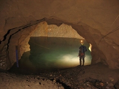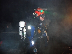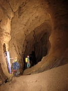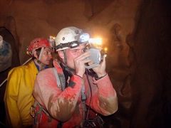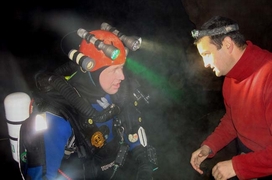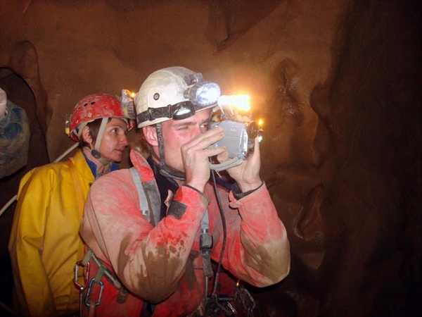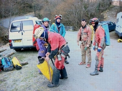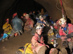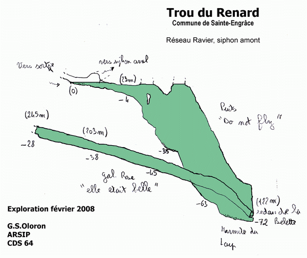 Les projets d'exploration naissent parfois de curieuse façon. Cet épisode au Trou du Renard est né d'une fascination, d'une passion commune pour « la Pierre ». Ce magnétisme trouve son origine auprès de saines lectures. Aux premiers émois cavernicoles, j'éprouvais le besoin de retrouver, dans les livres, l'expression de pareilles stimulations, d'émotions, voire d'addiction pour le monde des cavernes. « Rivière sous la Pierre » de Jean-François Pernette fut le premier à tomber en ces mains néophytes. Je l'ai relu bien des fois, y replonge régulièrement. Rassuré, conscient que d'autres êtres normalement constitués succombaient à l'appel des ténèbres, je compulsais dans la foulée le deux « Jusqu'au fond du gouffre » de Corentin Queffelec, dont le charme suranné n'a d'égal que l'intensité des relations que ces hommes entretinrent avec la caverne. Côté passion, l'existence de l'ARSIP, une structure centralisatrice assurant la sauvegarde et la gestion des informations, achevait de m'émoustiller : un jour j'irai, voir cet « ailleurs » d'un peu plus près. 20 ans sépareront les lectures de l'aventure. Tout commença, comme bien d'autres projets, autour d'un verre. Michel Lauga évoquant les siphons « à revoir », faute de disposer d'informations fiables sur les dernières découvertes. Et de fil en aiguille, d'explorations en rencontres, de discussions en projets, l'affaire prit un tour.. pendable, une fin de camp dans une source béarnaise profonde. Les opérations « lourdes », la mobilisation d'équipes nombreuses n'existent qu'autour de projets d'envergure. Certes. Mais jamais la sauce ne prend sans un catalyseur, un fédérateur d'énergies et de volontés. Tâche ingrate s'il en est, mais fondamentale. On doit à Frédo Verlaguet d'avoir soutenu le projet et impliqué son club (le G.S.Oloronnais), le C.D.S. 64 et sa dynamique commission « Plongée », ainsi que l'ARSIP. M. J.Pierre Accoceberry, le propriétaire de la cavité nous gratifia de son soutien. Qu'il trouve en ces lignes l'expression de notre gratitude. La masse de matériel et le nombre de spéléologues à faire transiter par la cavité imposait une sécurisation des équipements en fixe. Trois sorties furent nécessaires pour vérifier les amarrages en place, installer de nouveaux points d'ancrage, assurer des mats de perroquets et réaliser les premières prises de vues. Le 27-01-08 : équipement, portage du matériel et prises de vues vidéo (Charles Piault, Antoine Cabotiau, Frédo Verlaguet). Le 02-02-08 : Finition de l'équipement, portage, prises de vues vidéo (Jef Godart, Rémi et Daniel Kircher, Pierre Garat, Vincent Cazares, Elodie Lagorce, Henri Laborde, Antoine Cabotiau, Yannick Dolinski). le 16-02-08 : Portage et vidéo (Antoine Cabotiau, Charles Piault, Yannick Dolonski, Eric Garcia et Cécile en surface). De mon côté, toutes les charges pondéreuses sont conditionnées dans des sacs de portage renforcés, leurs longes sont contre-assurées. Certains ont été confectionnés pour l'occasion par Edith et Bernard Trouvé (Société Résurgence), afin de garantir la sécurité de tous les participants. Dans cette descente composée de puits successifs, une charge en chute libre serait ravageuse pour les coéquipiers situés aux étages inférieurs. J'ai prévu une plongée au Trimix, avec un recycleur en version électronique (Megalodon version APECS 2.01 http://www.customrebreathers.com), planifié des tables jusqu'à –130m pour parer à toute éventualité. C'est qu'il est question d'un arrêt sur rien, à –78, dans un puits géant. Je ne disposais pas encore de la vision de Mickey Douat, basée sur la connaissance des particularités géologiques locales. Le 17 au matin, c'est le grand jour. Frédo a bien motivé « les troupes ». Le 17-02-08, 4ème sortie : Portage matos et plongée (remontée ensuite du matos). Première équipe : Vincent Cazares, Charles Piault, Claude Watiaux, Antoine Cabotiau, Eric Garcia, Nicolas Chalk encadré par PM Abadie, Eric Kammenthaler, Brice Maestracci , Vincent Augé, Isabelle Lacrouts, Olivier Lacroix, Laurence Boisloret, Bruno Nurisso et Frank Vasseur. L'équipe a été rejointe par JD Larribau et Patrice Baqué. TPST 9 h 30. Deuxième équipe : Henri Laborde (avec le Champagne), Henri Lalanne (le doyen 63 ans), Nicole Chassagne, Pierre Garat, Régis Lejeune et Jean-Paul Guardia. TPST 4h. Les premiers arrivent avant l'aurore, Antoine était même là la veille au soir ! Nous nous retrouvons au café de Saint-Engrâce, trop exigu pour l'équipe au complet. J'ai plaisir à retrouver d'anciennes connaissances : Vincent, partenaire d'un stage technique de descente de canyon, Brice, celui de mon premier stage de plongée souterraine. A 9 heures du matin, en février, dans le fond de la vallée, ça caille sévère. Les sous-vêtements polaires, cagoules, combinaisons sont prestement enfilés. Histoire de se réchauffer, nous empilons les charges, dont la masse, le nombre et le volume augurent bien de l'huile de genoux. Personne ne traîne à l'extérieur, nous filons rapidement vers l'entrée du gouffre. Tout est prévu, il y a même un kit d'Oenologeothérapie prêt à l'emploi à l'entrée… étant donné son contenu, on serait presque tenté d'y recourir ! Le premier contact ne paie pas de mine, petites désescalades intimes, un petit laminoir et…. du noir : une enfilade de jolis petits puits, avantageusement éclairés par la guirlande de casques qui évolue en cadence, par sauts verticaux, vers le fond. Je m'attendais à une cavité tectonique, des puits intimes, effilés, sombres, austères, tapissés d'argile. Rien de tout cela. La surprise est de taille. Passé les puits d'entrée et le départ vers le réseau Saint-Vincent (l'amont de la cavité qui bute sur d'autres siphons), les puits s'évasent. La section dépasse 5 à 6 m, un ruisselet, issu de la surface, percole et clapote sur les parois, de magnifiques cascades pétri
