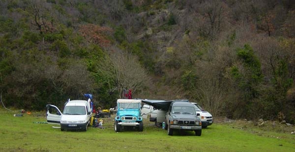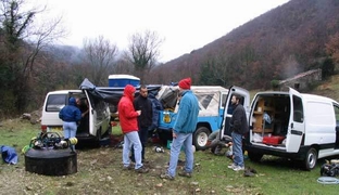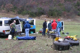 Les véhicules sont rapprochés, une bâche, tendue par-dessus, constitue un abri appréciable, du crachin tenace, des rafales de vent. Le compresseur ajuste quelques bouteilles à la pression d'utilisation.