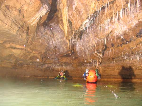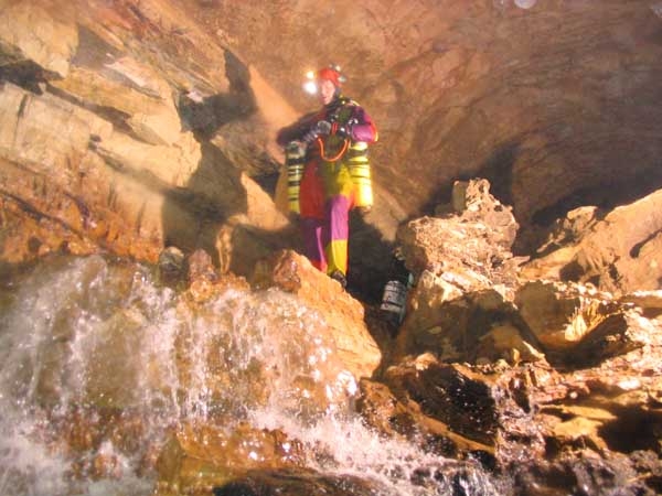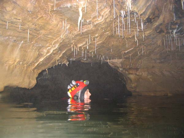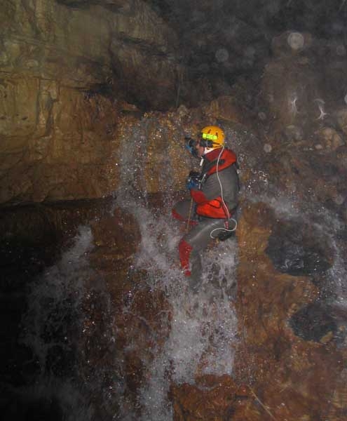 Au-dessus de la cascade, une voûte mouillante, tout juste amorcée en cette période de hautes eaux, débouche dans une jolie galerie richement concrétionnée. Les parois se resserrent progressivement, et lorsque l'abondant concrétionnement s'y cumule, on est contraint, à deux reprises à s'élever de quelques mètres vers les voûtes. Unique possibilité pour trouver un passage pénétrable pour un cavernicole tout de néoprène vêtu et d'acier bardé.
