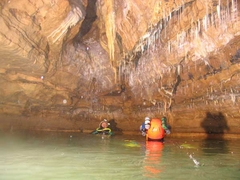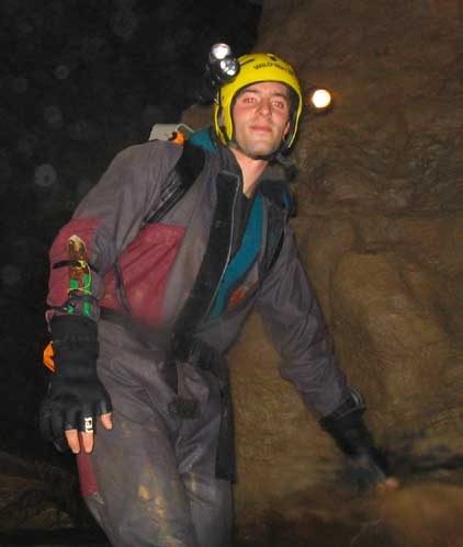 Passé le S.4, Mehdi, Damien et Jean-Pierre se déséquipent. Ici, la cavité se divise en deux branches, parcourues de ruisseaux souterrains qui confluent dans la vasque de sortie du S.4. Vers le nord-ouest, 240m de galeries accidentées nous attendent. Il faut d'abord remonter un étroit méandre, puis escalader 4m pour rejoindre le vaste conduit fossile sus-jacent.