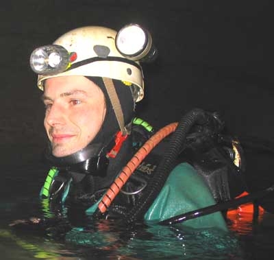 Un dernier salut aux copains, et j'entame la partie solitaire de l'exploration, chargé de deux bouteilles de 7 litres harnachées latéralement et de deux relais -12l de nitrox.