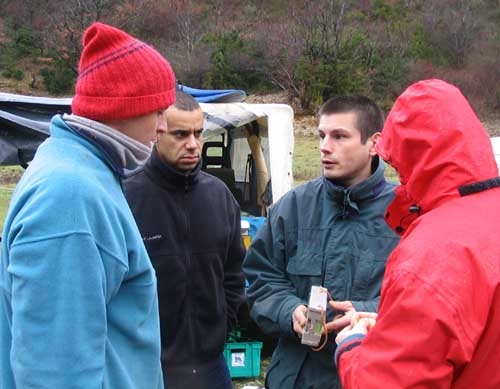 Mais de toutes les destinations, les témoignages sont les mêmes. Brouillard et pluie. Catherine et Jean-Pierre ont passé la nuit sur place, il pleut depuis la veille au soir. Toute l'équipe est là à l'heure, mais le froid et la pluie ont altéré la motivation. C'est une bande de velléitaires frileux qui s'organise au débouché du thalweg, dans la vallée de Veyrières.