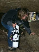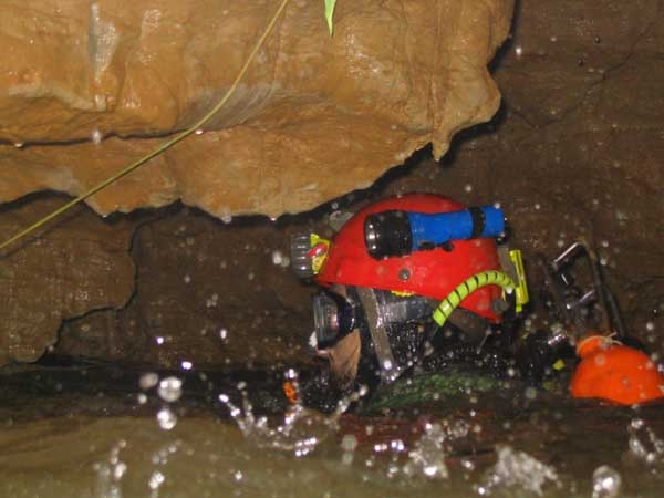 Il s'agit d'un laminoir très argileux qui débouche subitement dans un modeste élargissement sableux où l'eau s'éclaircit. Un talus de sable grossier vient jouxter la voûte en amont, rédhibitoirement impénétrable. Une bonne partie du débit de la rivière qui parcourt cette branche de la cavité provient pourtant de là. A 15m de la vasque, par une profondeur de –9, j'amarre le fil d'Ariane, en guise de conclusion prématurée. Dommage.