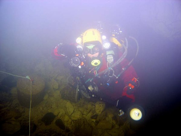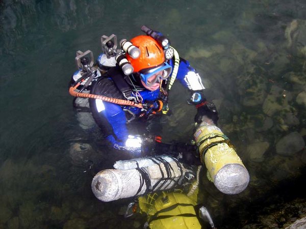 La roubine qui délimite les départements du Gard et de l'Hérault, à proximité du littoral, semble bien anodine, une fois l'estive venue. Pourtant, chaque « épisode cévenol » (phénomène de précipitations abondante) génère des « vidourlades » (crues violentes) tant dévastatrices que médiatisées. Quelques dizaines de kilomètres en amont, un ruisseau cévenol, parmi d'autres, sourd des massifs schisteux. A la manière la Vis, ce rù esquive le soleil, dès lors que son cours croise les calcaires. Le fleuve Vidourle, gonflé de confluences souterraines, regagne la surface sous les remparts médiévaux de la ville de Sauve, huit kilomètres plus aval. Les multiples regards sur ce parcours hypogée, le relief ruiniforme, les cours d'eaux asséchés, mais aussi les épidémies de choléra, eurent tôt fait d'attirer les karstophiles. Dès la fin du 19 ème , Edouard-Alfred Martel conclut une première campagne sur une note on ne peut plus enthousiaste : « Il y là un Padirac inachevé ! ». La Fontaine de Sauve, résurgence du Vidourle souterrain, est une source assurément capricieuse. La moindre averse sur les Cévennes la fait réagir. La visibilité est médiocre, une diète pluviale d'une quinzaine de jours s'impose pour ambitionner un champ de vision équivalent à 2m. Plusieurs groupes montpelliérains tentèrent quelques plongées dès 1968. Le GEPS de Marseille, alors à la pointe des évolutions techniques, réalise une avancée décisive jusqu'à la trémie (200m de l'entrée) en 1972. La galerie est vaste, surmontée de nombreuses cloches d'air, labyrinthique, chaotique, le courant pousse. En 1978, les provençaux poursuivent dans la Fontaine, prolongée entre-temps par une autre équipe jusqu'à 240m. Après avoir franchi une étroiture à 240m, ils progressent jusqu'à une cloche située à 500m de l'entrée, après un point bas à 30m. « Le courant et la turbidité des eaux, ajoutés à la configuration de cette résurgence rendent son exploration délicate. Néanmoins, vu la direction, la configuration et les distances actuellement parcourues de part et d'autres, la jonction avec le réseau aval du Grand Aven nous semble désormais possible ». Le Grand Aven de Sauve, phénomène d'ampleur remarquable, bée 1000m au sud-ouest de la Fontaine. Une falaise d'une trentaine de mètres couronne un cours d'eau temporaire, activé lors des crues. Ambiance néo-Guinéenne garantie. En aval comme en amont, des puits révèlent de vastes bassins. Les difficultés d'approche diffèrent à 1979 les premières plongées, fructueuses des deux côtés, à nouveau grâce au GEPS emmené par Jean-Louis Vernette. Par la suite, le potentiel de ce karst suscite plusieurs plongées, alimentant progressivement la Fontaine en fils d'Ariane qui, contrairement au produit de la treille, ne bonifient pas avec le temps. A partir 1998, une équipe languedocienne, flanquée de quelques provençaux, s'attaque à la fontaine. Bien que de précieux documents aient été produits par le G.E.P.S. sur d'autres cavités du secteur, les informations sur la Fontaine sont plutôt maigres. Peu de détails descriptifs, pas de topographie ni de croquis. Devant l'ampleur de la tâche, nos barboteurs procèdent par ordre. Tous les itinéraires plus ou moins balisés et toutes les cloches sont d'abord topographiés. Les anciens fils sont déséquipés et remplacés par de la cablette décamétrée sur le cheminement principal. Les galeries secondaires, les cloches, les conduits parallèles sont équipés de fil d'Ariane et raccordés au câble. A l'aube du présent millénaire, nous en sommes à tourner en rond à 210m de l'entrée, à nous casser le groin sur une fracture étroite surmontée d'une trémie. L'affaire ne sera pas simple. Le conduit est vaste (certainement plus de 8 x 6m de section), sa morphologie est complexe (dédoublements du conduit, section irrégulière), le courant augmente au fur et à mesure de la progression (delta de sortie étalé sur 300m) et une zone étroite limite tant le volume que le nombre des bouteilles utilisables. En 2000, changement de stratégie. Les plongées sont organisées en hautes eaux. Après de vaines immersions et une étude approfondie de la topographie, une série d'étroitures révèle enfin un ancien fil, une galerie plus humaine. L'anguille, souvent présente dans ce secteur, nous l'indiquait en s'y repliant. Mais la joie est de courte durée. Après la zone étroite, nous tournons quelques mois encore dans le « grand laminoir », en bouclant de façon récurrente sur le fil principal, jusqu'à la cote 270m. Le « team » se remet à fouiner et, en remontant au travers de la trémie, une puissante cloche est retrouvée. Elle sera baptisée « la cathédrale marseillaise » en hommage au binôme de Jean-Louis Vernette qui l'avait attendu là, à 230m de la vasque, pendant sa dernière pointe. Il avait eu le temps de l'apprécier sous tous les angles et, tempérament phocéen à l'appui, l'évaluait apte à loger la « Bonne Mère ». A nouveau, l'étude de la topographie oriente de façon décisive les investigations, et c'est via les voutes que la voie s'ouvre. Le fil du GEPS retrouvé ouvre la voie d'un puissant collecteur. Sa section, grossièrement circulaire, dépasse 5m. Les ripple-marks, au sol, orientent sans équivoque les évolutions. Dans la foulée, nous atteignons la cloche dans laquelle avaient buté les explorations, à 500m de l'entrée. La poursuite des explorations est à présent modérée par deux zones d'étroitures. Les limites d'autonomie des 2 x 9l + relais sont atteintes. Marche arrière à nouveau. Retour à la case « fouinage ». Les moindres recoins de la source sont passés au peigne fin et en 2001, c'est gagné. Un jour de meilleure visibilité, une lucarne confortable nous ramène de l'autre côté de la trémie des 210m. La seconde étroiture, à 270m, est aussi évitée. La grosses bouteilles, le propulseur entrent en