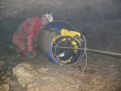 L'accès de la cavité n'est pas facile, surtout lorsqu'il faut transporter du matériel lourd et fragile comme les recycleurs et les propulseurs. Pendant toute la journée du samedi, les spéléos du CD81 FFS transporteront des centaines de kilo d'équipement jusqu'à l'entrée du siphon n°1, tandis que Dominique, Samuel, Eric et Cedrik franchiront le siphon pour acheminer les propulseurs et les blocs de secours jusqu'à l'entrée du deuxième siphon. Dimanche, Claude et Nadir plongeront dans le 2 ième siphon pour déposer 3 bouteilles de sécurité à 300, 600 et 900m de distance.