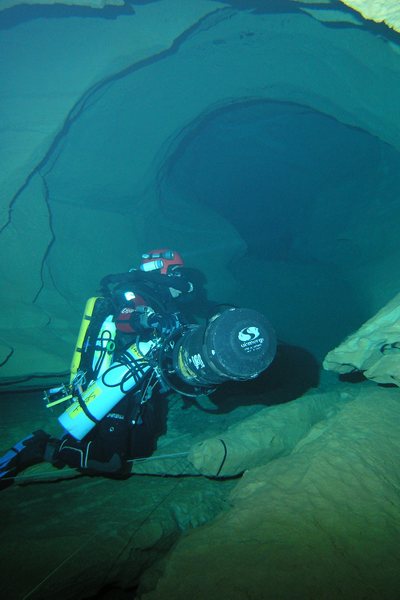 La galerie entre le premier et le deuxième siphon mesure 40 mètres. Un talus « sportif » oblige les plongeurs à un petit effort physique avant de retrouver l'eau. |