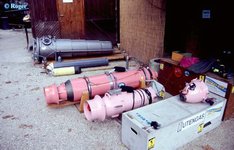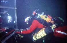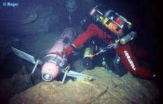 Etant doté d'un seul circuit fermé, je choisis de mettre dans le siphon trois bouteilles de décompression de 15l que je laisse à l'entrée, trois bouteilles de 20l chargées avec des mélanges respirables de 0 à -60. J'en conserverai deux avec moi plus une en compagnie d'un maialino *( scooter ) de 2km d'autonomie. Je les abandonnerai vers 1600-1700m de l'entrée.
