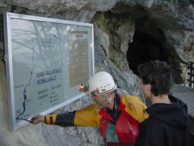 Comme son nom l'indique l'attrait de la Kristallhöhle réside dans la présence que d'importantes quantités de cristaux de calcite. Cette véritable masse de rhomboèdres et scalénoèdres qui plaît tant aux visiteurs fût depuis plusieurs siècles ( les premières mentions de la grotte datent de la fin du XVIIème siècle) l'objet de visites de la part de chasseurs de minéraux; après une période d'exploitation commerciale pour ar l'industrie des détergents c'est au milieu des années trente du XXème siècle que commença l'aménagement touristique de la grotte. Aujourd'hui les visites se terminent à l'endroit où les dimensions de la galerie principale se retrécissent et où la voûte s'abaisse juste avant le passage de la rivière; suit une partie dite "spéléo" qui se développe alors dans des conduits de dimensions parfois confidentielles, parfois plus comfortables et vient buter en son terminus actuel sur un siphon. Le conduit objet de nos expéditions, de la partie suit le cours de l'actif en adoptant la plupart du temps un profil en trou de serrure aux dimensions parfois confidentielles qui rendent la progression peu aisée lors des portages; la difficulté principale étant résidant dans le passage de "l'Engstelle" (étroiture) rétrécissement d'environ 2,5 mètres de largeur et d'autant de longueur, avec un pincement en son milieu de 28cm de hauteur. Passé la "Engstelle" on s'avance alors dans un couloir aux dimensions plus agréables où seuls une suite de gours et une chute d'eau de 5 mètres de hauteur ralentissent la progression . .