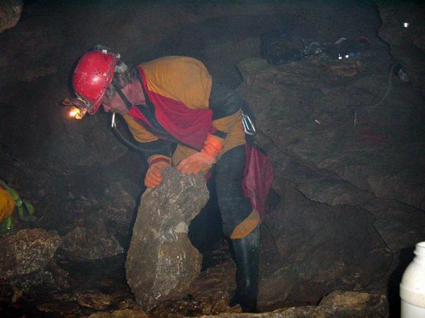 "…… Maxime jette encore un dernier coup d'oeil à mon équipement et me donne le "go" pour le début l'exploration. Je prends l'azimut et m'immerge; déjà après quelques mètres j'émerge dans une salle d'environ 8 mètres de long. Le tamponnoir qu'il a laissé lors des plongées d'équipement du S1 est toujours bien visible dans la paroi de droite au-dessus de l'eau. Devant moi se présente un monticule de glaise dont je dois escalader le versant abrupt afin de poursuivre l'exploration. Le sommet de ce monticule se trouve en ce moment sous l'eau, dont dont le niveau est 10 à 20 centimètres plus bas que lors de ma première visite de février . Je me hisse en m'aidant de la corde de 11mm fort opportunément installée à cette fin par Maxime lors de sa dernière plongée puis je m'avance avec des mouvements de reptation sur le sommet du monticule, le franchis et m'immerge immédiatement à nouveau. J'aperçois dans le faisceau de mes lampes à l'autre extrémité du lac la galerie qui continue droit devant moi. L'eau contrairement à mes attentes craintes est d'une clarté cristalline ce qui nourrit mes espérances me laisse espérer de pouvoir enfin trouver la suite.