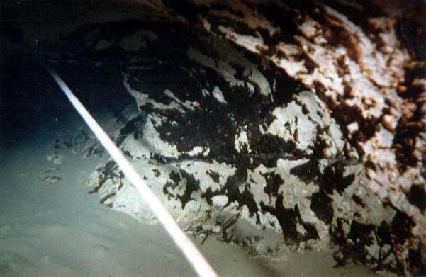 En larguant le 3 ème plomb j'ai soulevé des sédiments et j'ai continué la progression malgré le fait que la visibilité s'en soit ressentie. Mais m'engageant sous la voûte basse le conduit maintenant commence vraiment à devenir étroit, en progressant je soulève en rampant encore plus de sédiments et la visibilité s'annule peu à peu. Vu l'absence totale de courant attendre que les sédiments se déposent serait une longue attente, je le sais car nous avions en son temps mesuré la vitesse de sédimentation. Par ailleurs je sais aussi pour avoir contrôlé mes instruments peu de temps auparavant que je n'ai pas encore atteint mes ¼ de consommation , et en conclus donc que lors d'une prochaine plongée durant laquelle je n'aurai qu'à suivre le fil installé et pourrai faire attention à ne pas soulever trop de sédiments, le passage de ce pincement sera certainement possible. Pour l'heure je décide alors de m'arrêter et de rebrousse chemin. Je dépose le dévidoir et m'en retourne. J'aurai déroulé et posé 70 mètres de nouveau fil.