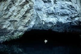 Rapidement, le tour du propriétaire est fait et l'installation du camp nous laisse le temps d'aller reconnaître le lac d'entrée, long de plus de 200m. Une première balade en canot confirme la nécessité de refaire l'escalade de 45m au faîte de laquelle se prolonge la cavité.