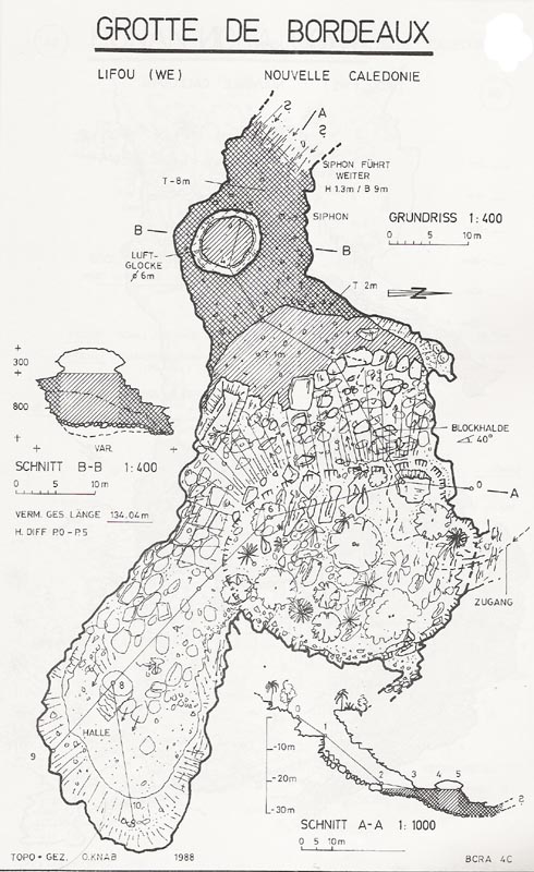 Explorée et topographiée en février 1988 par Oliver Knab : 134.04 m. La Qualité de l'eau change : 02.88 = 30m de visibilité. Ph Brunet décrit : Les bulles d'air décrochent des morceaux du plafond et la visibilité est rapidement proche du zéro dans une eau de couleur laiteuse. Siphon exploré par Ph.Brunet le 31.7.1995. Ph.Brunet explore la galerie noyée sur 150m , s'arrêtant sur un éboulis terminal à–14m de profondeur. Bibliographie : Grottes de Lifou, Nouvelle Calédonie, 1995, p.43 et 45, CH et Y.Thomas, Ph.Brunet, B.et J.Lips, Höhlenpost Nr.78 ,1988 p.37 – 47,O.Knab , Speleonautic 88