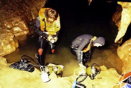En 1978 Jean-Marc Mattet plonge le siphon terminal sur 150m (-38). En 1979 avec Lucienne Golenvaux, ils progressent jusqu'à 200m (-50). En Avril 1980, Olivier Isler poursuit cette jusqu'a 220m (-66) "arrêt sur puits". Le 13/10/1989, Patrick Jolivet revoir le terminus. En Mai 1992 Planéte Bleue, effectue une étude sur le Sphaeromidès Raymondi.