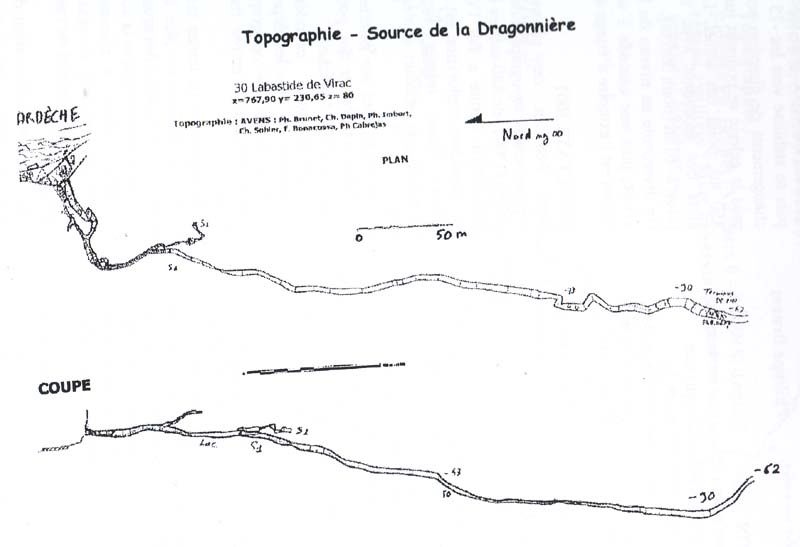| Situation La source de la Dragonière (ou Dragonnière de Labastide) s'ouvre en rive droite et à 12 mètres au dessus de l'Ardèche, au sommet du méandre de Gaud. La source de l'Esclapaire, qui lui est liée, est située plus bas et en aval, au bord de l'Ardèche. Elle constitue avec d'autres venues immergées, les exurgences pérennes du système.